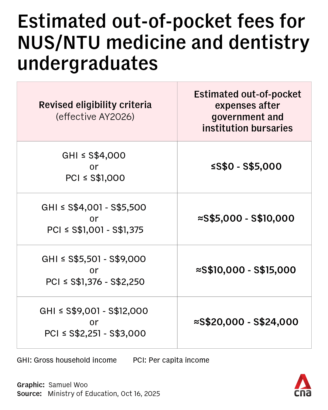 Meanwhile, the government bursary for medical and dental undergraduate students will be revised so that those who qualify for the highest bursary tier pay no more than S$5,000 per year in tuition fees for the 2026 academic year. This amount takes into account the financial assistance provided by their university.