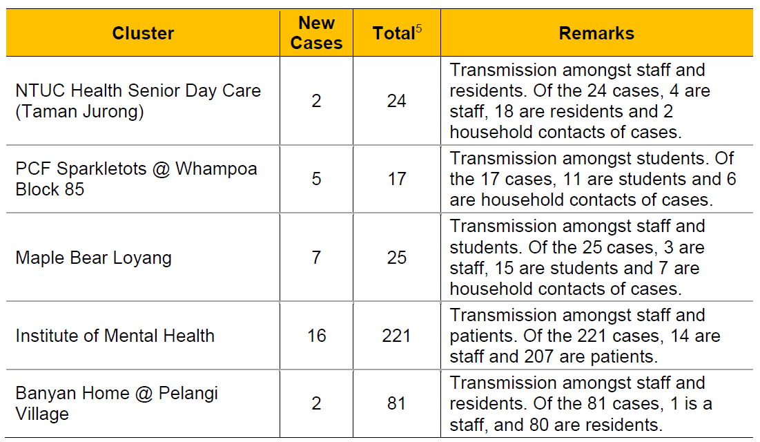 Clusters at Maple Bear Loyang, NTUC Health Senior Day Care (Taman Jurong) and Banyan Home at Pelangi Village also added new cases.