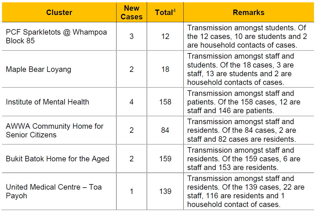 Clusters at Maple Bear Loyang, AWWA Community Home for Senior Citizens and United Medical Centre - Toa Payoh also added new cases.