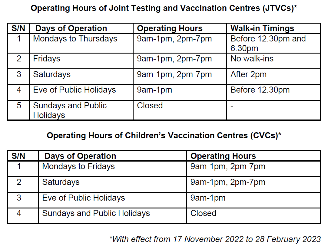 SINGAPORE: The extended operating hours at Joint Testing and Vaccination Centres (JTVCs) and Children's Vaccination Centres (CVCs) on Saturdays will remain in place until the end of February, the Ministry of Health (MOH) said on Thursday (Dec 22).