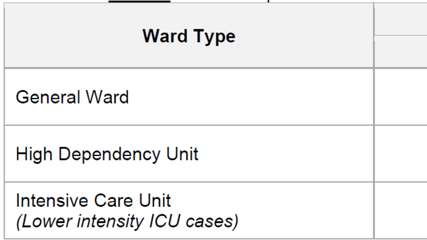 For the ICU, the fee benchmarks cover those who require lower intensity ICU care. For example, the fee benchmarks for lower intensity ICU cases in the ICU ward range from S$300 to S$600 per day, based on the doctor's office hours.