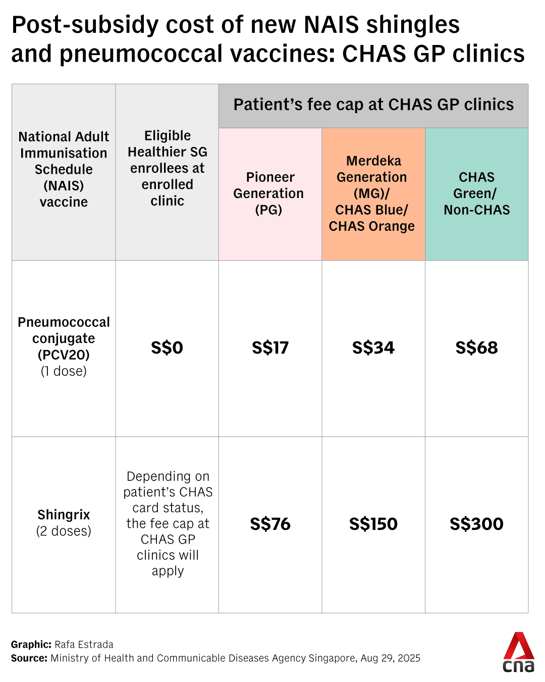 The vaccine's cost will depend on their CHAS card status or whether they are a Pioneer Generation or Merdeka Generation senior.