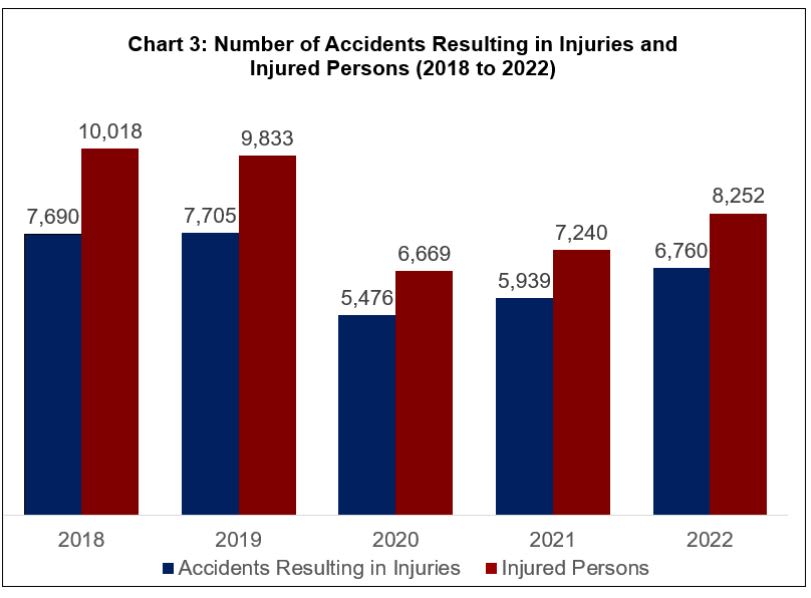 The number of accidents resulting in injuries increased by 13.8 per cent to 6,760 in 2022, compared to 5,939 in 2021. The number of people injured in accidents also increased to 8,252 in 2022, up 14 per cent from 7,240 in the preceding year.