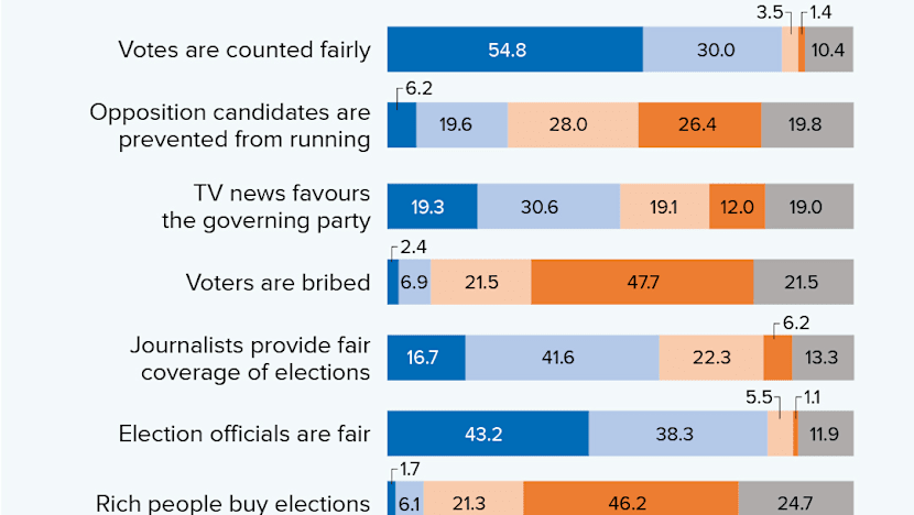Very few (under 10 per cent) respondents felt that voters are bribed, that rich people buy elections or that voters are threatened with violence at the polls