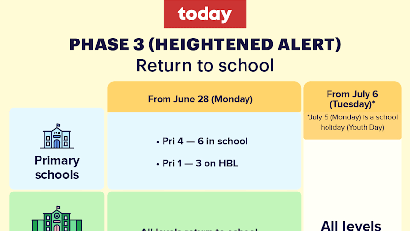 - Pri 4 to 6 pupils, Sec 3 to 5 and all JC and Millennia Institute students will return to school from June 28