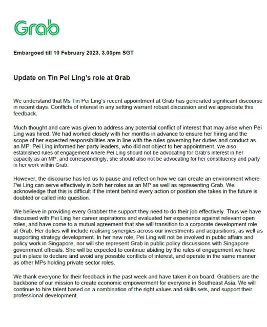 “We also established rules of engagement where Pei Ling should not be advocating for Grab’s interest in her capacity as an MP and correspondingly, she should also not be advocating for her constituency and party in her work within Grab," the firm added.