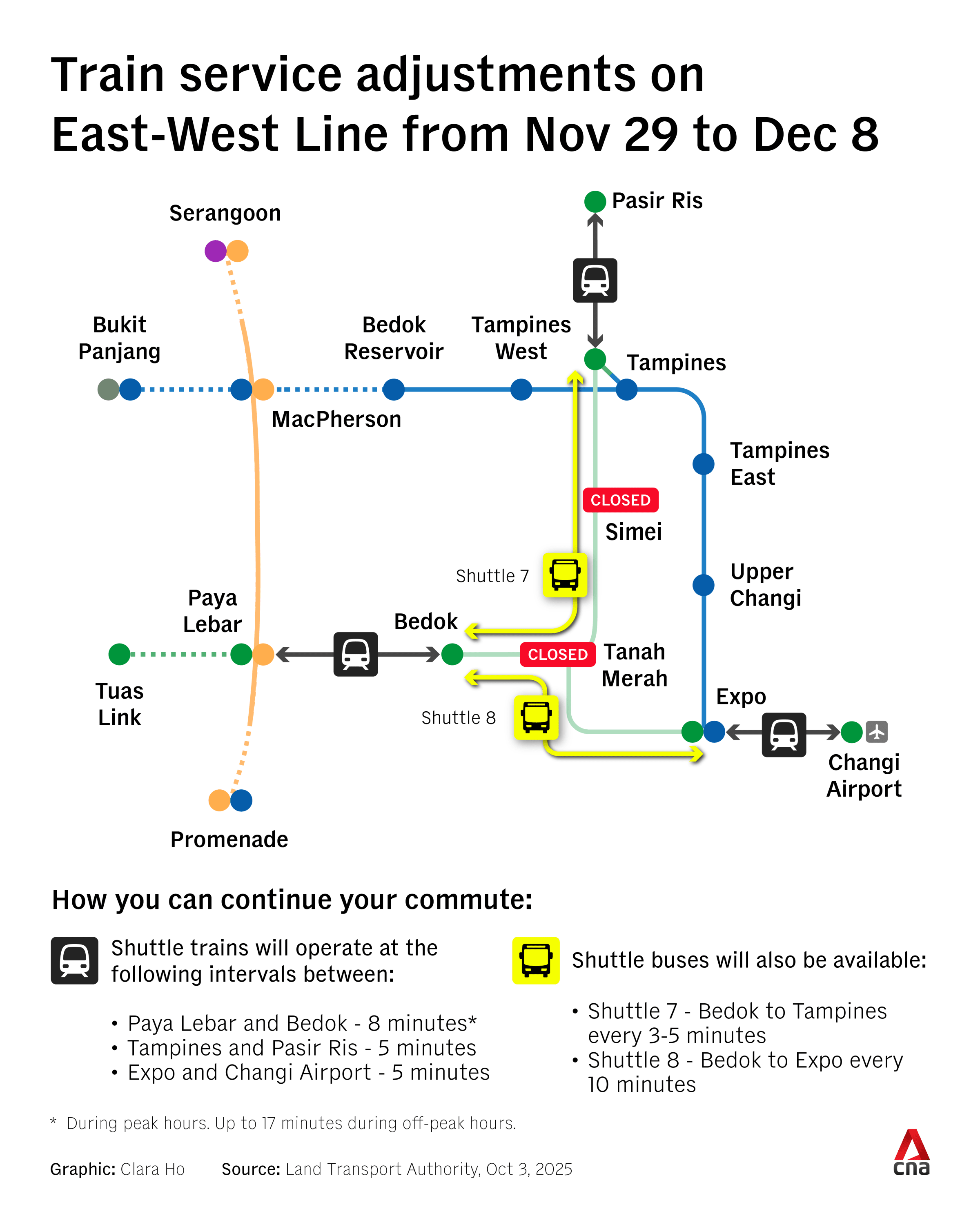 SINGAPORE: Commuters in the east can expect longer travel times between Nov 29 and Dec 8, as Simei and Tanah Merah MRT stations will be closed to facilitate track connection works to a new train depot.