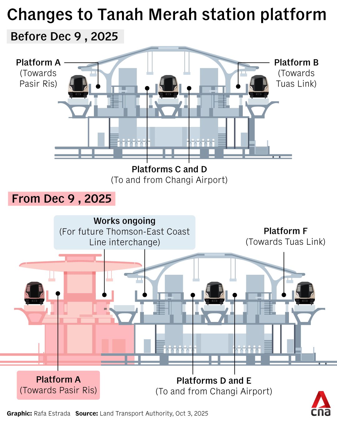 This means that commuters travelling from Expo or Changi Airport and transferring at Tanah Merah towards Pasir Ris or vice versa will have to go down to the station concourse and then go up to the new platform – a change from the previous cross-platform transfer.