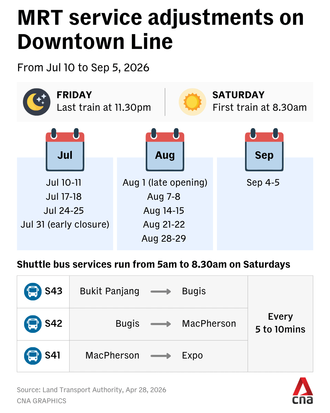 "We will also provide three shuttle bus services for commuters affected by the late openings on Saturday mornings, with connections at Bugis and Macpherson MRT interchanges," the Land Transport Authority (LTA), SMRT Trains and SBS Transit said in a joint media release on Tuesday (Apr 28).