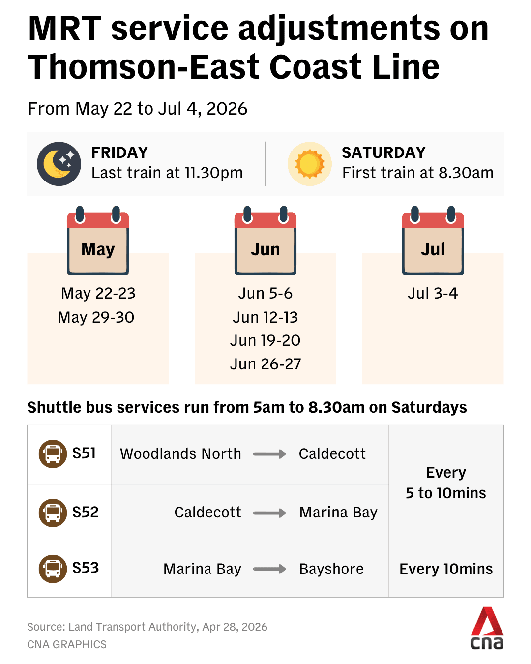 TEL services will be adjusted from May 22 to Jul 4 on Fridays and Saturdays, while DTL services will be affected from Jul 10 to Sep 5.