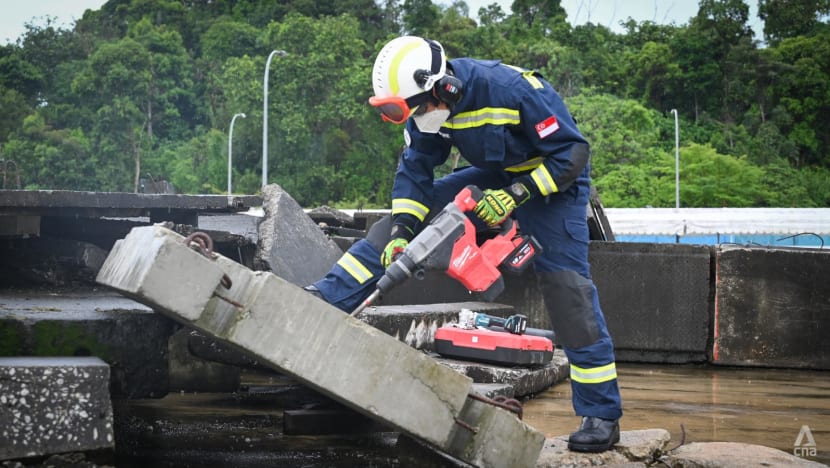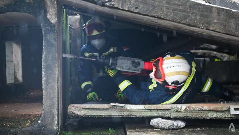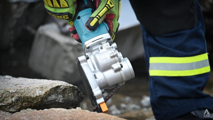 Before breaking or cutting through the concrete, the SCDF officers also stacked up wooden blocks in a process known as cribbing, with materials provided by local rescuers. Cribbing blocks are used to provide temporary support to prevent unstable structures from collapsing or moving unexpectedly.