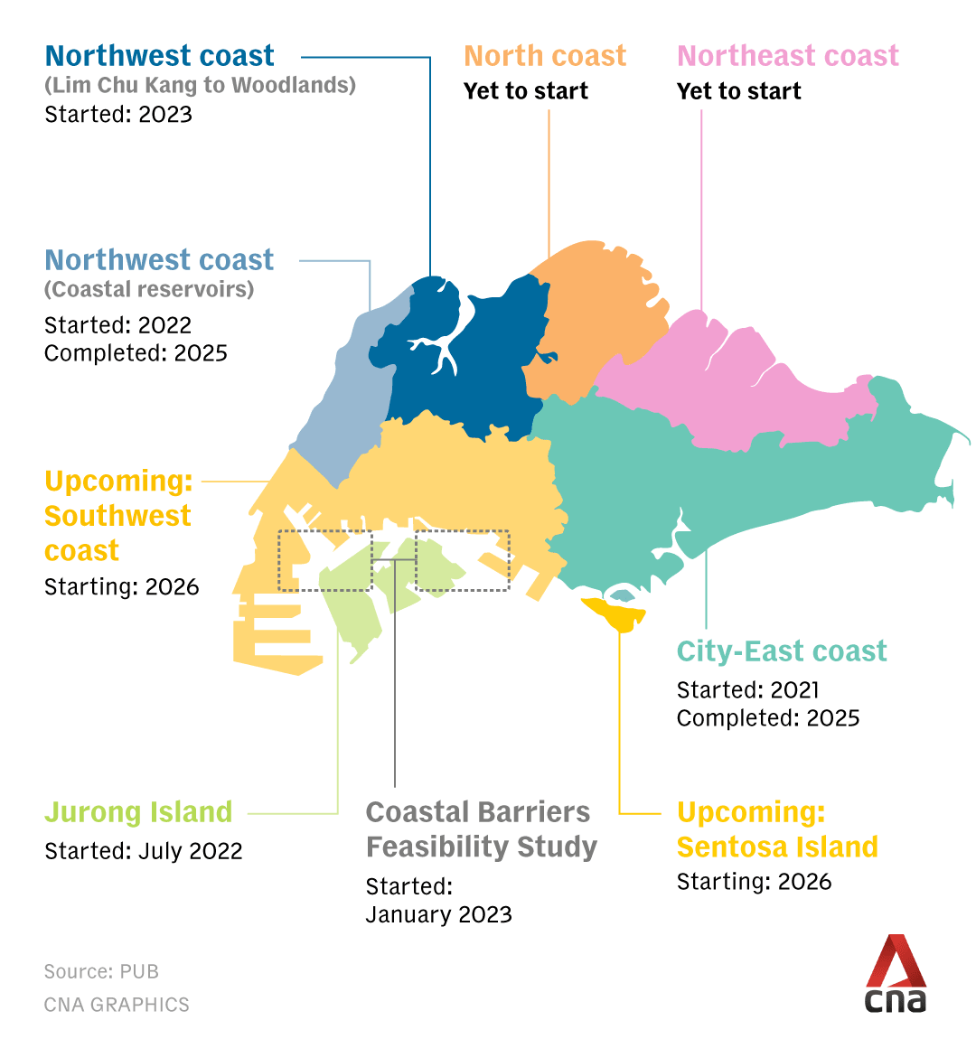 Detailed engineering designs for the recommended measures are being developed, with construction targeted to begin from the mid-2030s, subject to further studies. A separate study covering a 15km stretch of the northwest coast from Lim Chu Kang to Woodlands is on track to be completed this year.