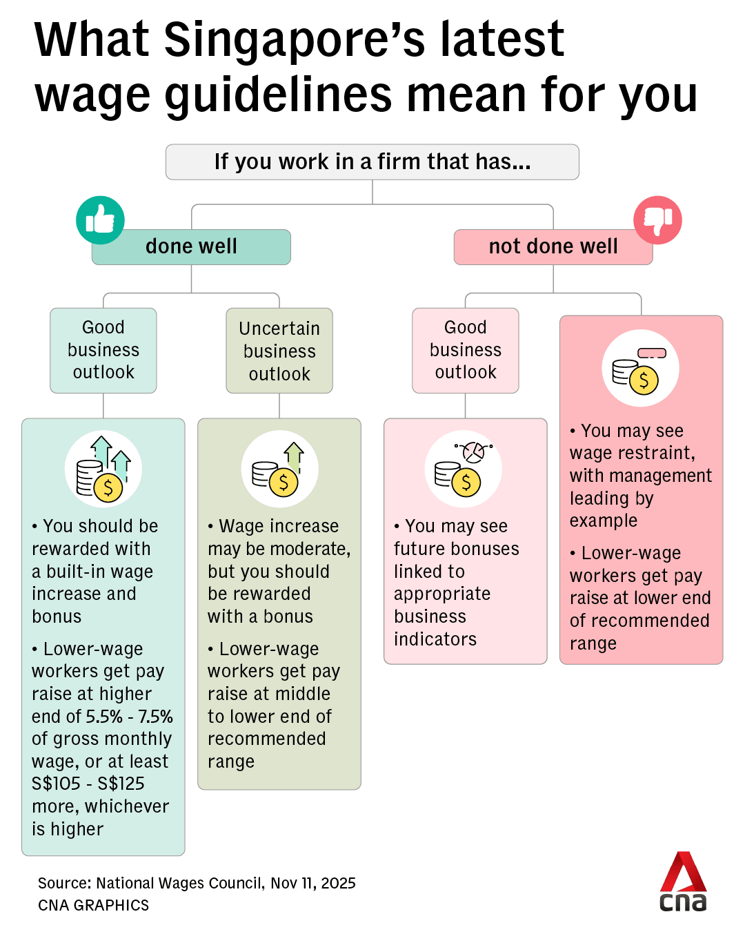 SINGAPORE: Amid uncertainties in the global economy and the cost pressures faced by businesses, employers who have done well but face uncertain business prospects may moderate built-in wage increases for workers, the National Wages Council (NWC) said on Tuesday (Nov 11).