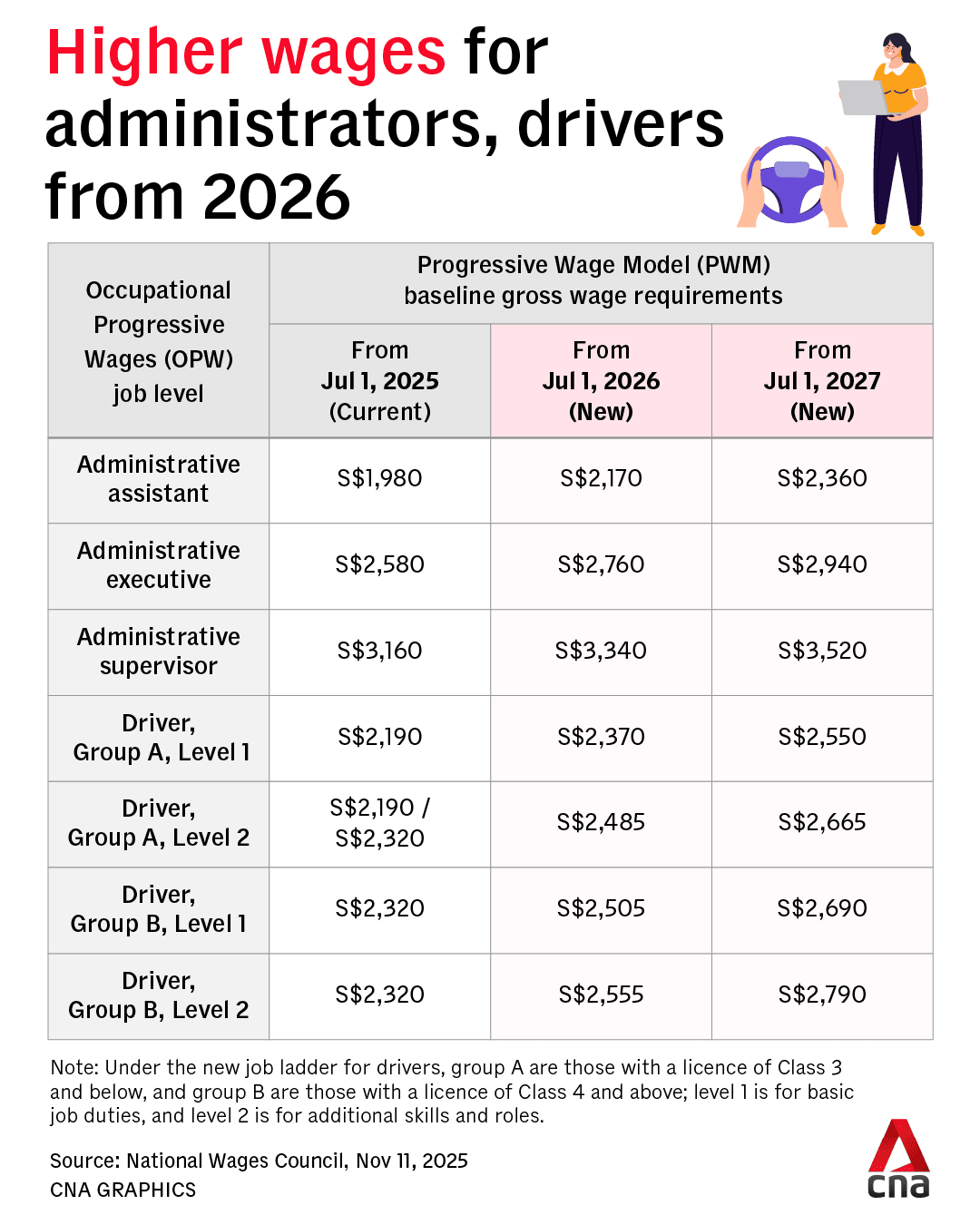 NWC recommended pay increases from 2026 to 2027 and new job ladders for these occupations. These will apply to a total of about 57,600 lower-wage workers who are full-time administrators and drivers.