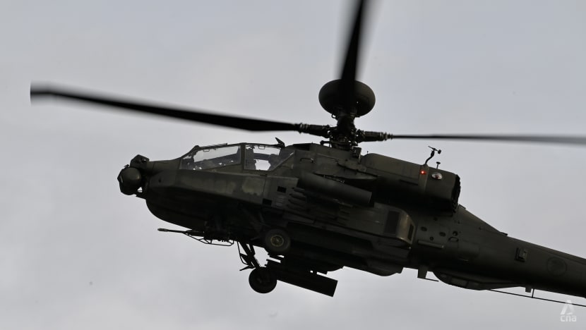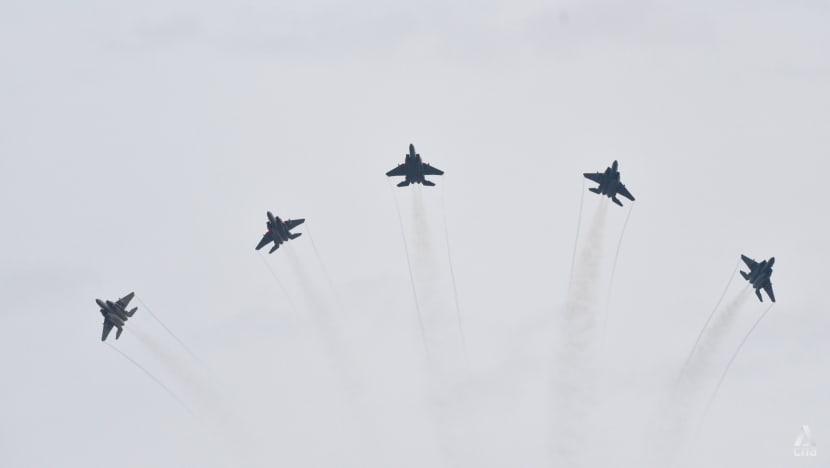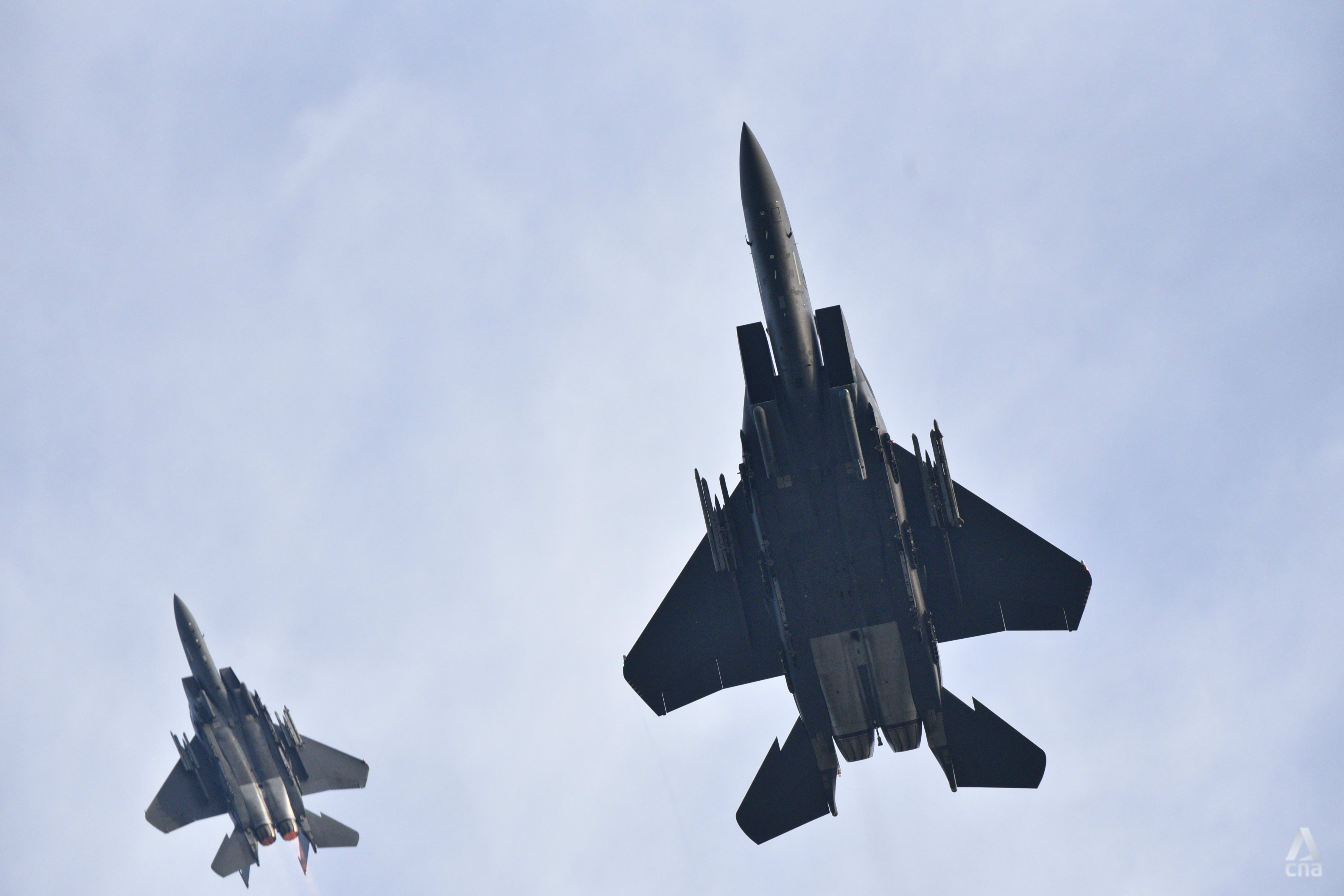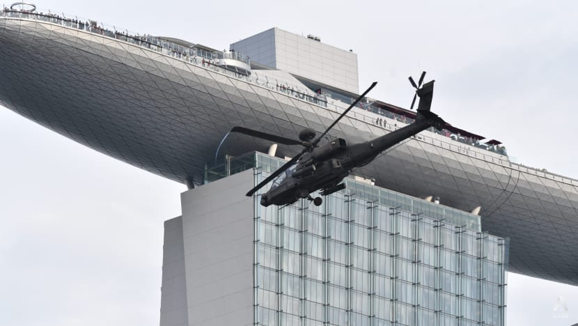Back in the skies, the sound of rotor blades thundered across Marina Bay as two Apache helicopters circled each other in the air. F-15SG fighter jets then performed stunts during the aerial display. Tearing past the floating platform, their roars filled the air, bringing the prologue to a close.