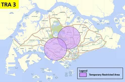 The three temporary restricted areas - which extend from ground level to 2,500 feet above mean sea level - will encompass The Float @ Marina Bay and heartland locations.