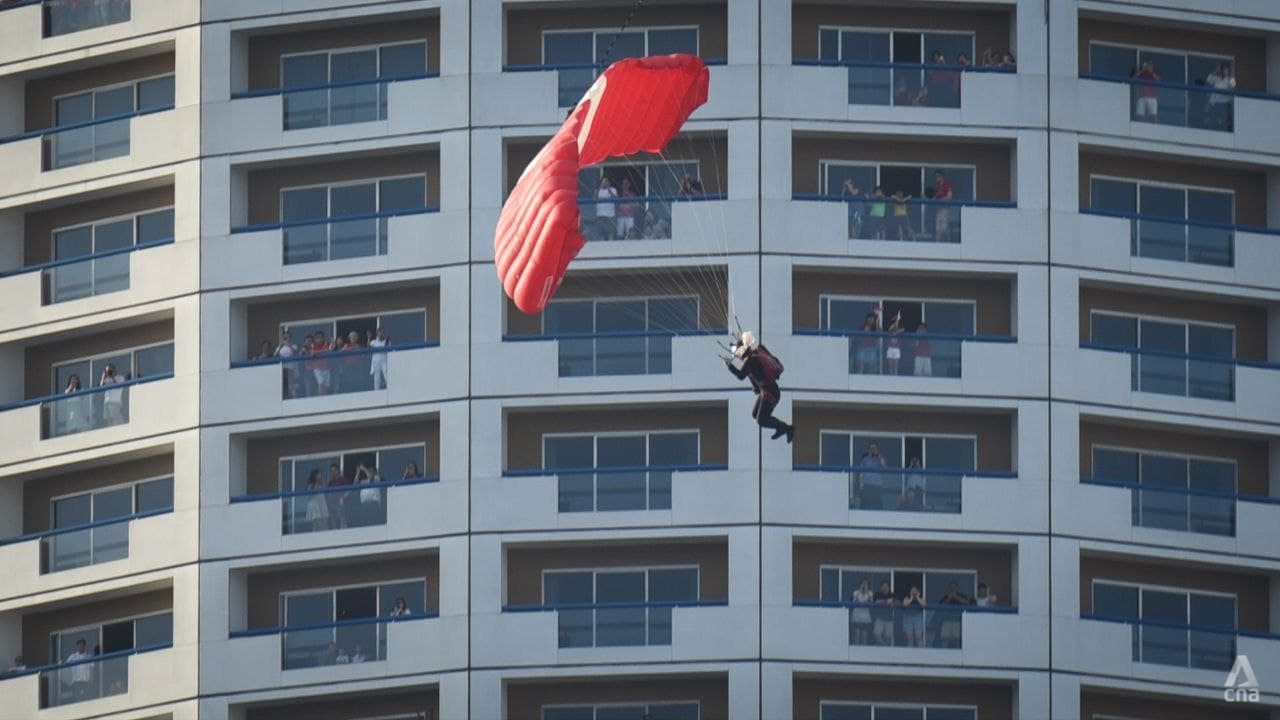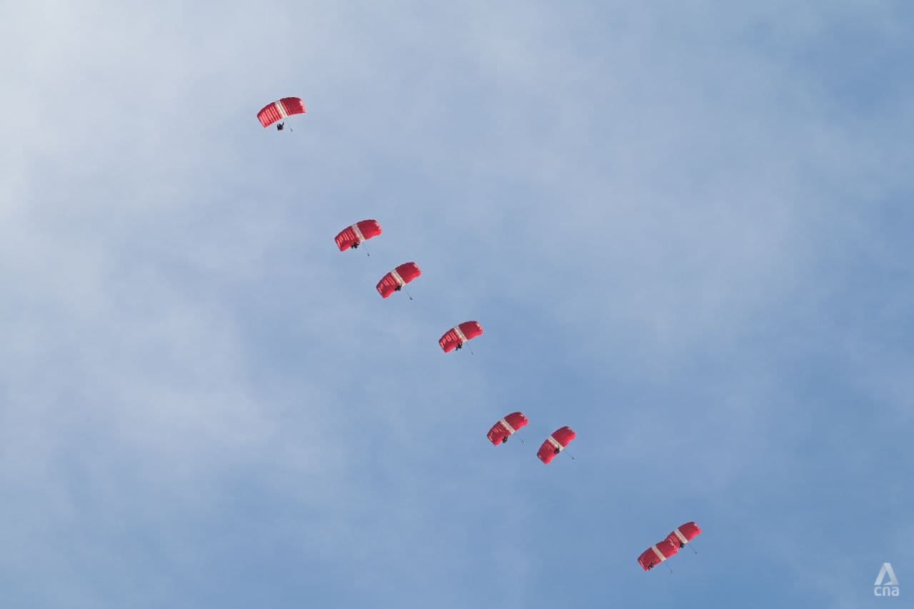 The Red Lions, the Singapore Armed Forces' parachutist team, pulled off their jump from 10,000 feet above with panache, and the Padang was bathed in neon colours for the show segment directed by filmmaker Royston Tan.