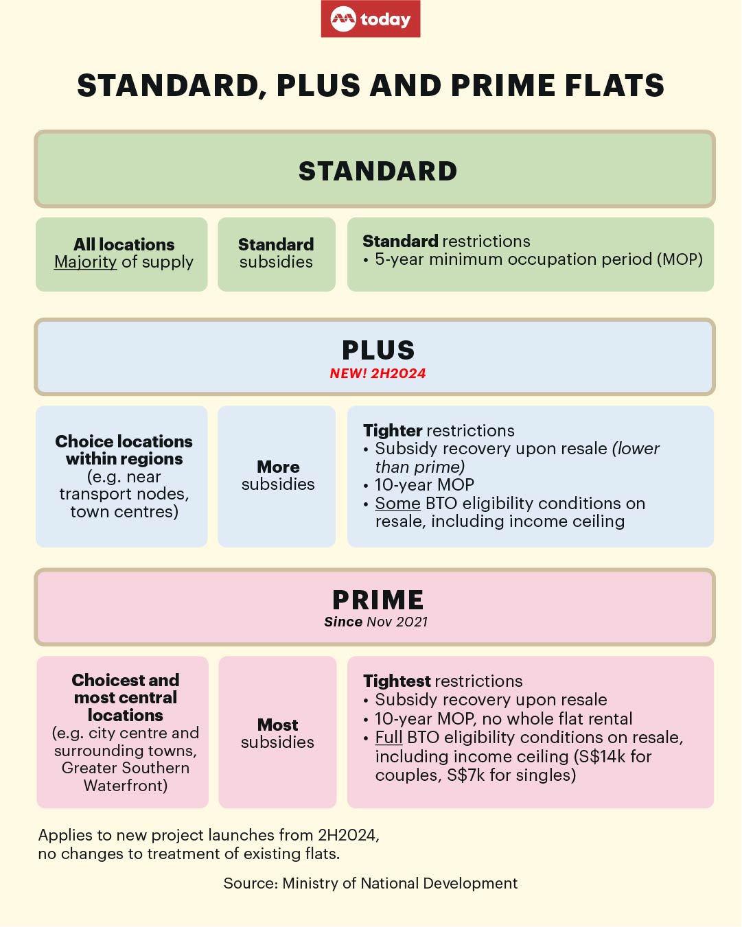 In a joint media statement, the Ministry of National Development and HDB said on Sunday that the Plus flats will come with more subsidies and tighter restrictions compared to the Standard BTO flats, but will have fewer restrictions compared to Prime flats.