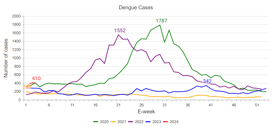 The highest weekly number of dengue cases was recorded in 2020, when the figure hit 1,787.