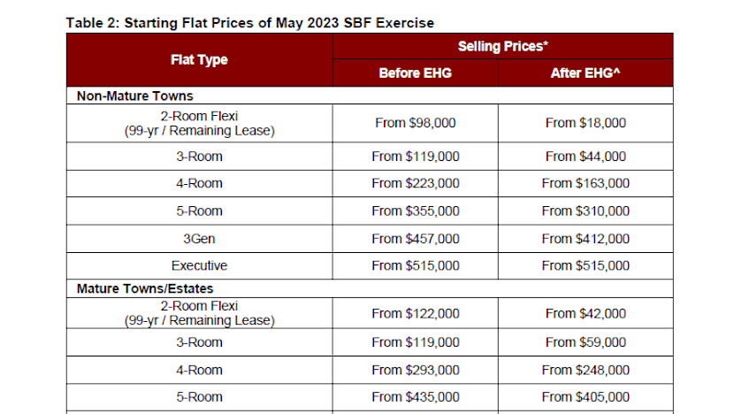The price for a four-room flat in a non-mature town starts from S$223,000, while a four-room flat in a mature town starts from S$293,000. These are before the Enhanced CPF Housing Grant.