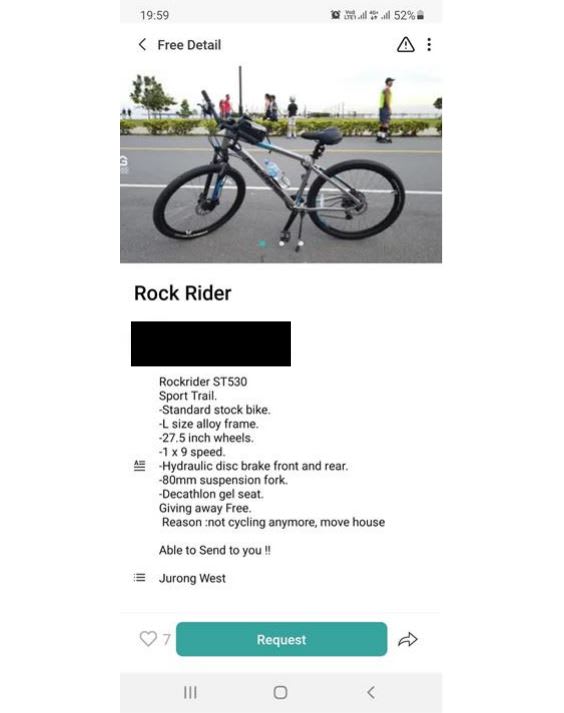 The police included examples of how some of these scams are advertised on these platforms. In one example on Goodhood, a user posted a picture of a bicycle to be given, along with an accompanying description of the bicycle's model, as well as option to choose between pick-up and delivery options.