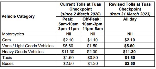 Revised Tuas Checkpoint toll charges from Mar 31