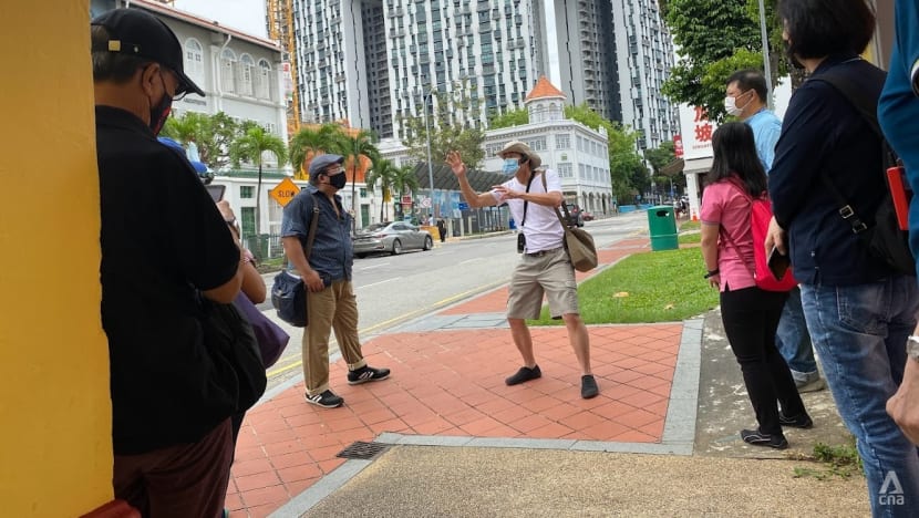 Mr Peter Tay guides participants on a twilight tour of Chinatown focusing on the women of early Singapore. (Photo: CNA/Try Sutrisno Foo)