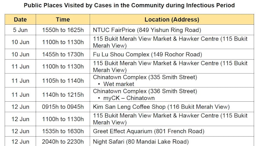 In its second update on the coronavirus situation in Singapore on Wednesday (June 16), the Ministry of Health (MOH) said that the infectious persons had been to these places at various times as shown in the chart below:
