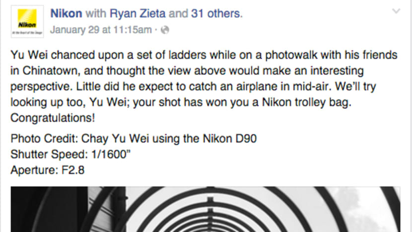 In the post — which has since been deleted —, the camera maker had awarded Mr Chay You Wei a Nikon trolley bag worth S$169 for being the week's NikonCaptures winner. He had submitted a black and white photo of an aeroplane flying overhead framed by a ladder, one which many netizens have pointed out to be a badly-photoshopped image.