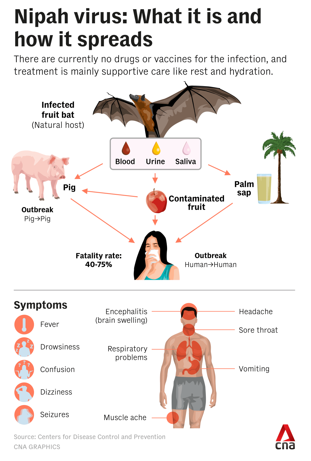CDA on Saturday reiterated its advice for travellers to affected areas to avoid food and drinks that may be contaminated by bats, such as raw date palm sap and fruit found on the ground.