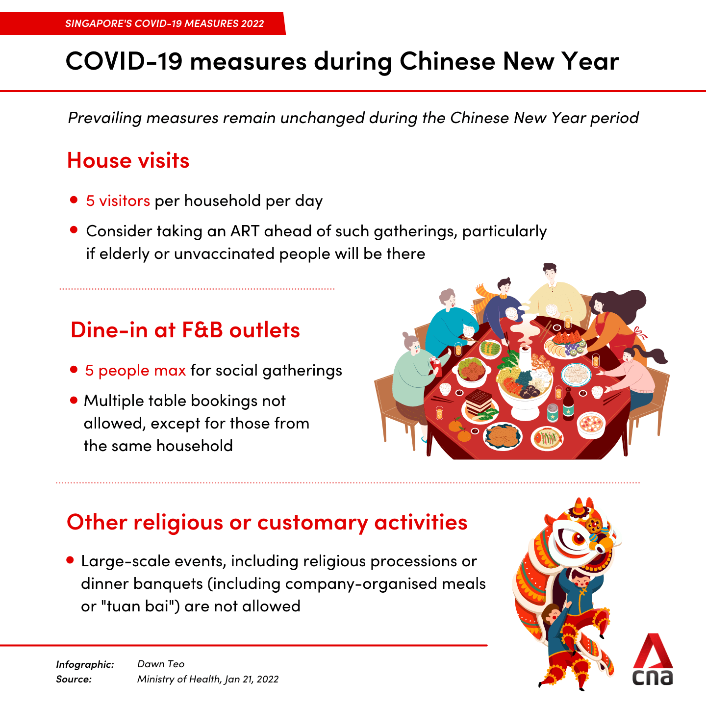 SINGAPORE: There will be no change to current safe management measures during the Chinese New Year period, with the maximum group size allowed for social gatherings to remain at five people.