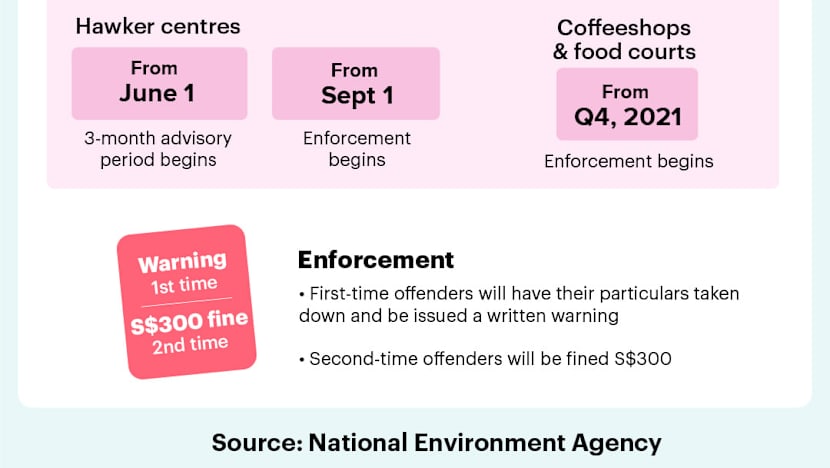 There will be no change and the enforcement for the tray return rule at food centres will begin on Sept 1, 2021 as earlier announced.