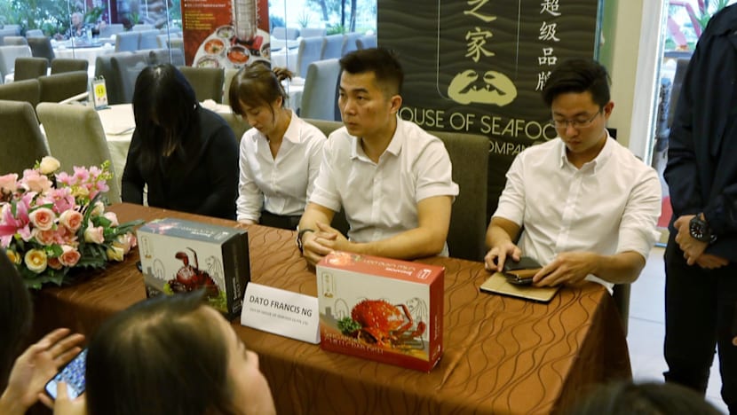 The House of Seafood management team at a press conference on Oct 25, 2019, apologising for putting live crabs in a claw machine.