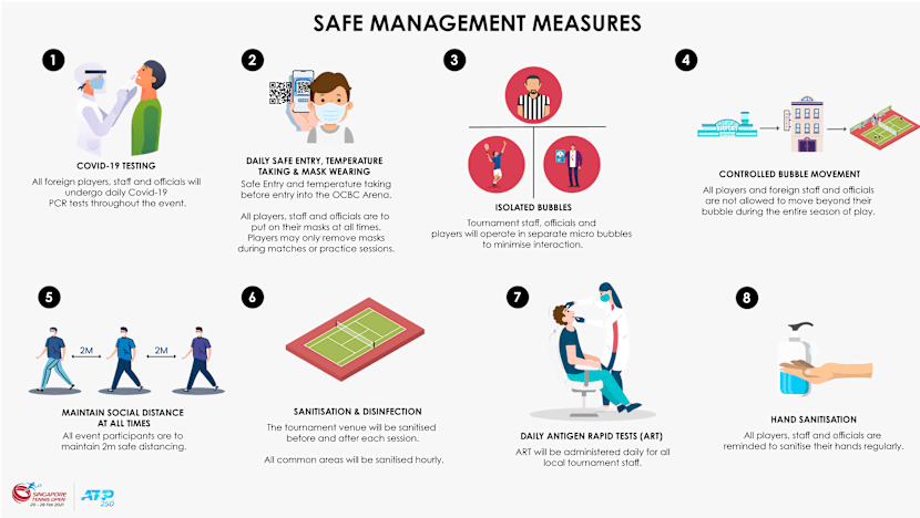 All players will undergo daily Covid-19 polymerase chain reaction tests throughout their stay in Singapore, while staff members, officials and volunteers here will have to undergo daily antigen rapid tests.