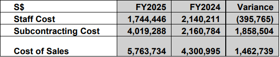 The company’s cost of sales, which includes staff and subcontracting costs, was more than S$5.7 million for FY2025, up from about S$4.3 million in the previous year.