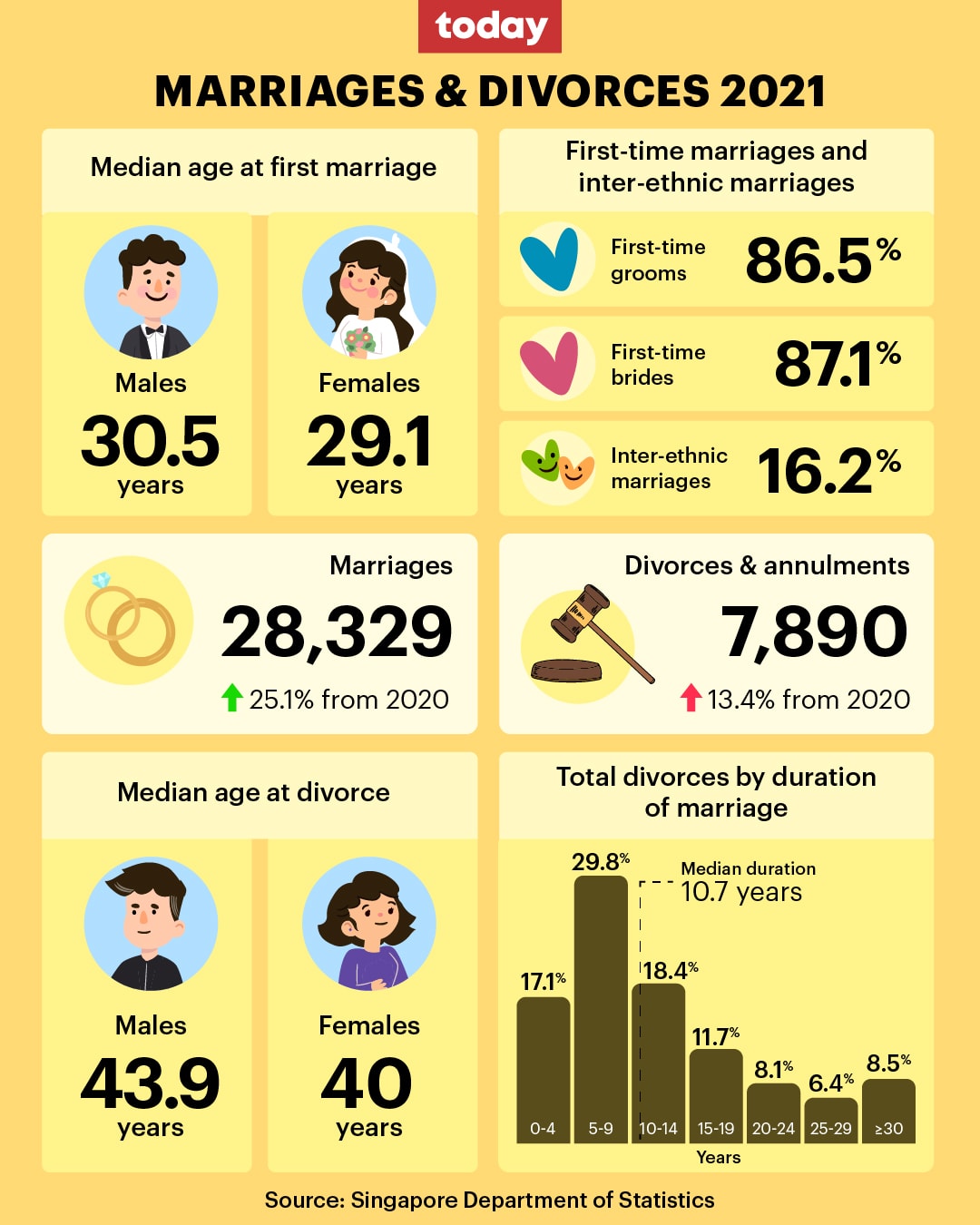 - Couples who were married for five to nine years accounted for the largest share of all divorces at 29.8 per cent, followed by those who were married for 10 to 14 years (18.4 per cent), and those married less than five years (17.1 per cent)