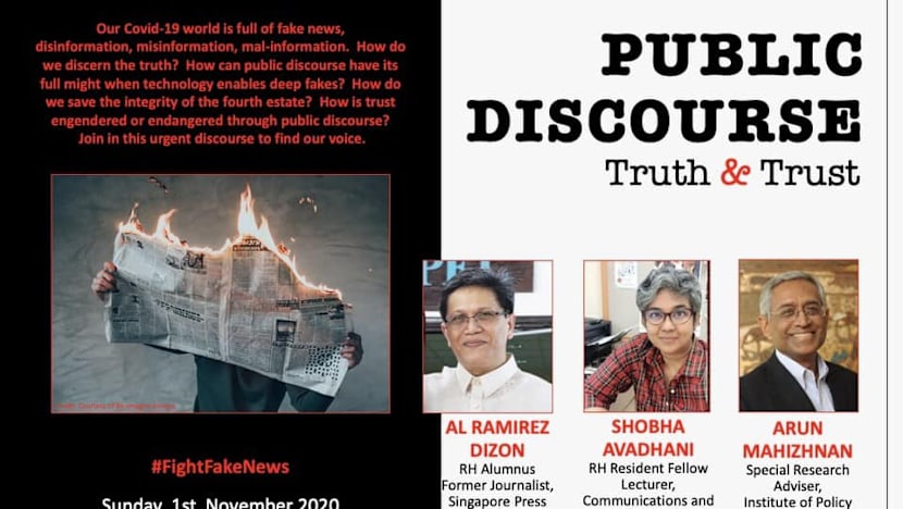 The “Public Discourse: Truth and Trust” webinar, organised by the Raffles Hall Association (RHA) and scheduled for Sunday (Nov 1), initially featured Professor Cherian George, a media studies professor at Hong Kong Baptist University, and Prof Donald Low, professor of practice at Hong Kong University of Science and Technology’s Institute of Public Policy.