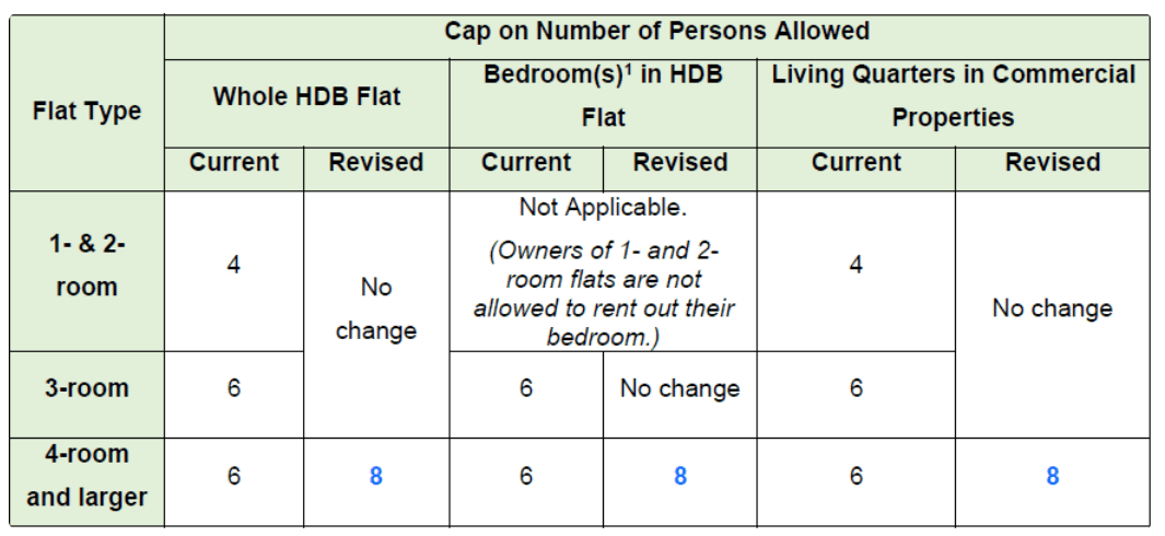 The increased occupancy cap will cover HDB flats that are four-room or larger, as well as living quarters of HDB commercial properties where the living quarters are equivalent to or larger than a four-room flat.
