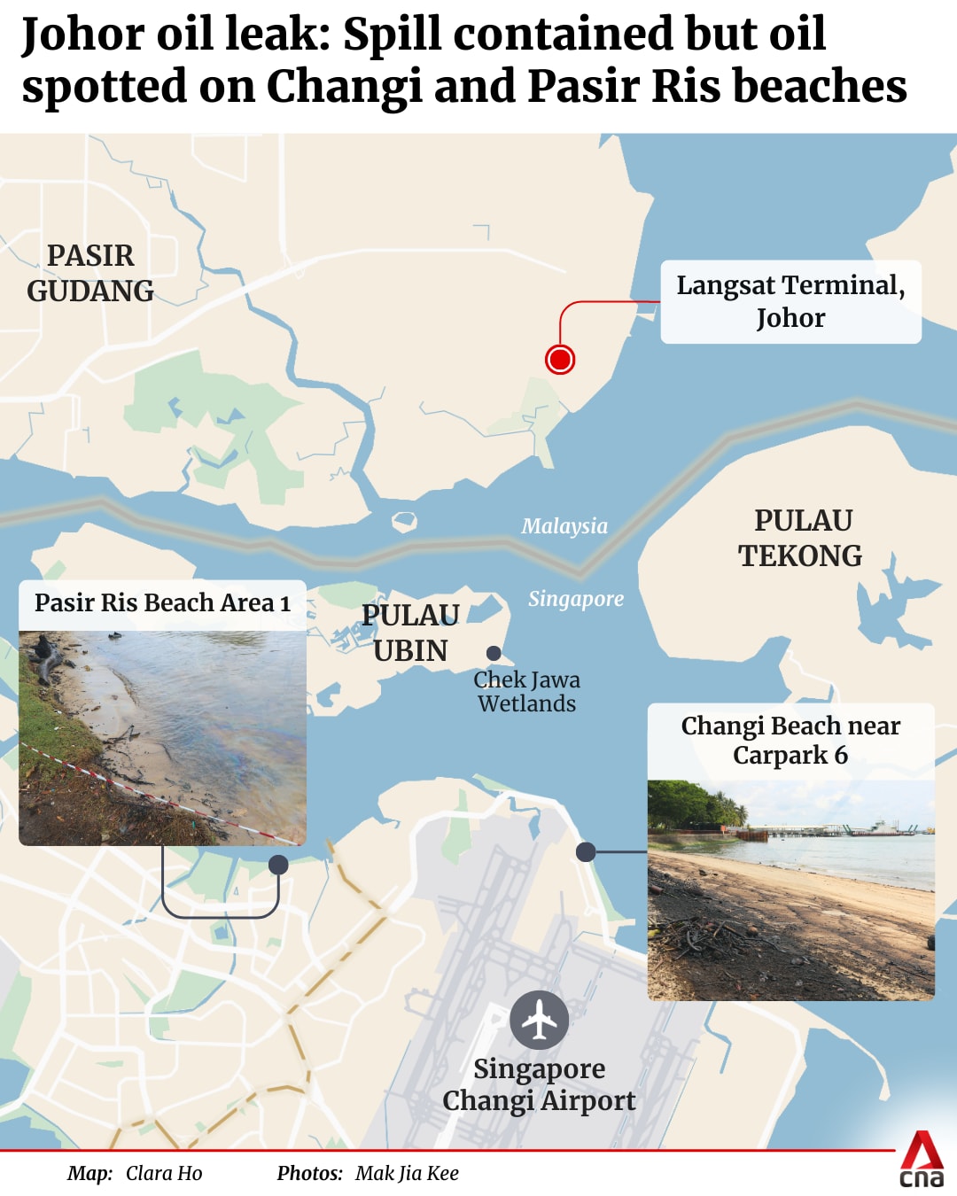 The oil leak has also reached the northern coast of Pulau Ubin and Pasir Ris Beach.