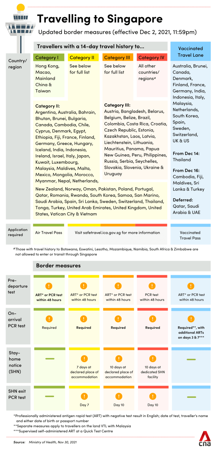 In further stepped up measures against the Omicron variant, travellers entering or transiting through Singapore from Dec 3, including travellers from Category I regions, must undergo a pre-departure test within two days of their departure for Singapore and produce a negative result.