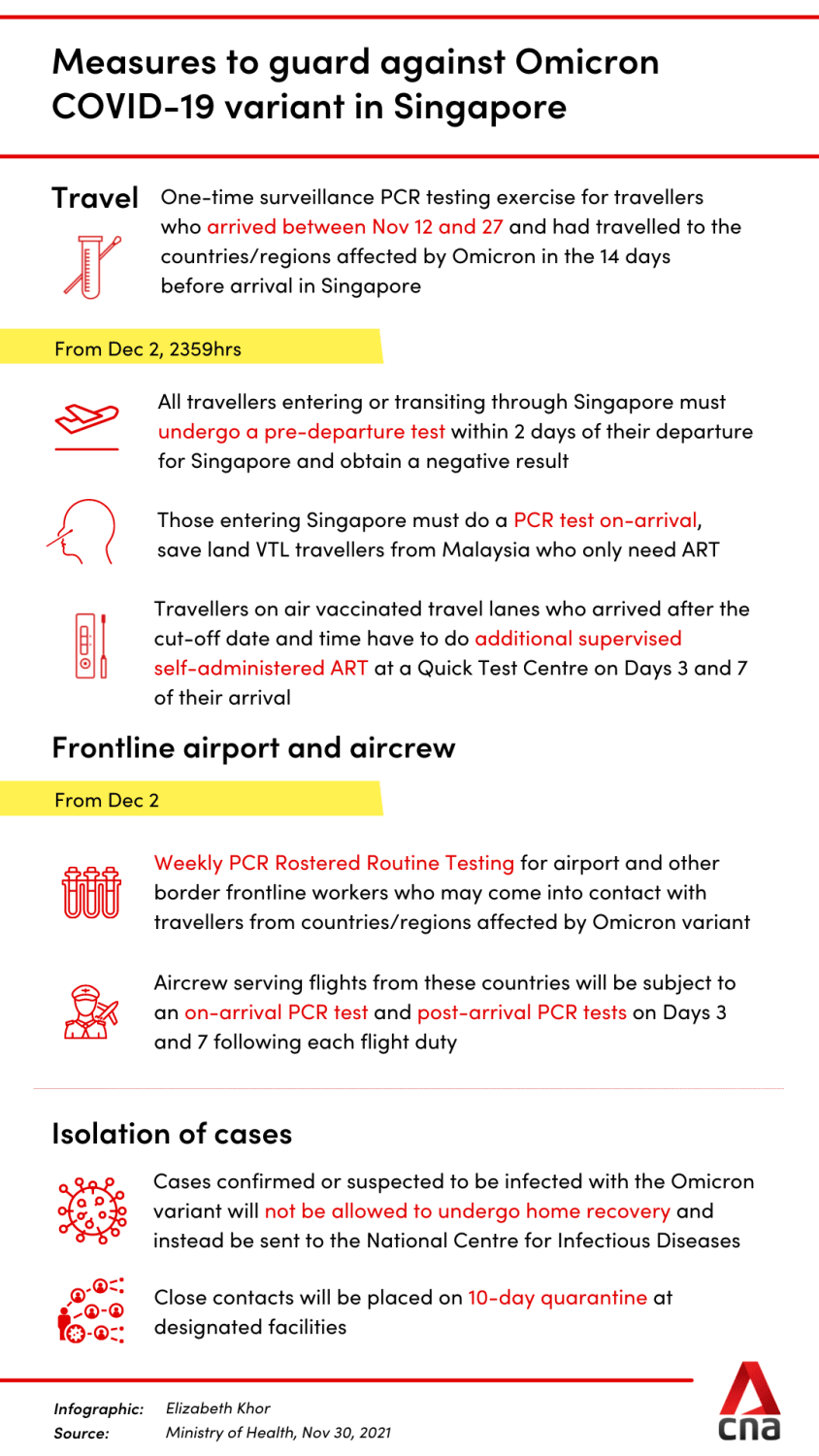 The ministry will also conduct a one-time surveillance PCR testing exercise for travellers who arrived between Nov 12 and Nov 27, and had travelled to the countries or regions affected by the Omicron variant in the 14 days before their arrival in Singapore.