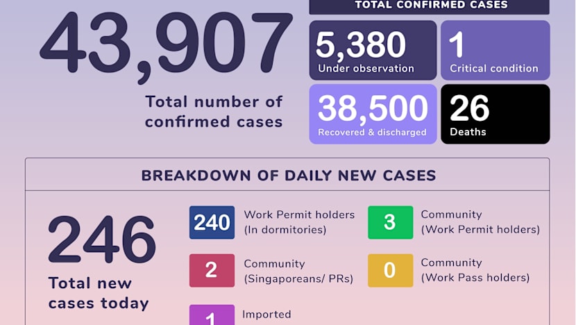 Of the 246 new cases, five are in the community. Two of the five are Singaporeans, with one detected because the 49-year-old man had been deployed to frontline Covid-19 operations while investigations are ongoing for the other, a 73-year-old man.