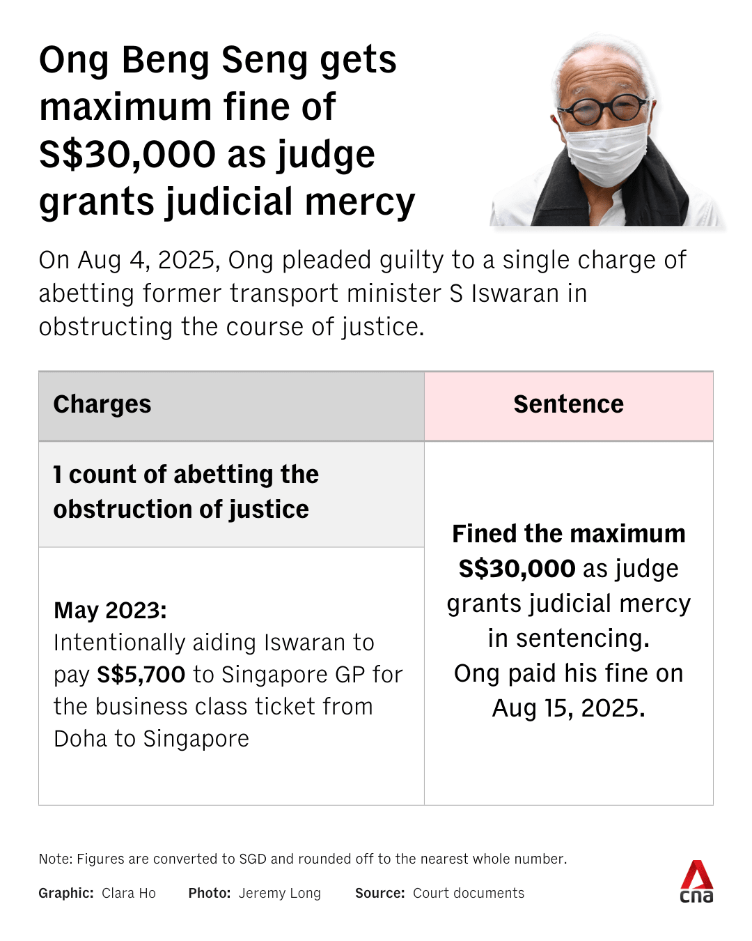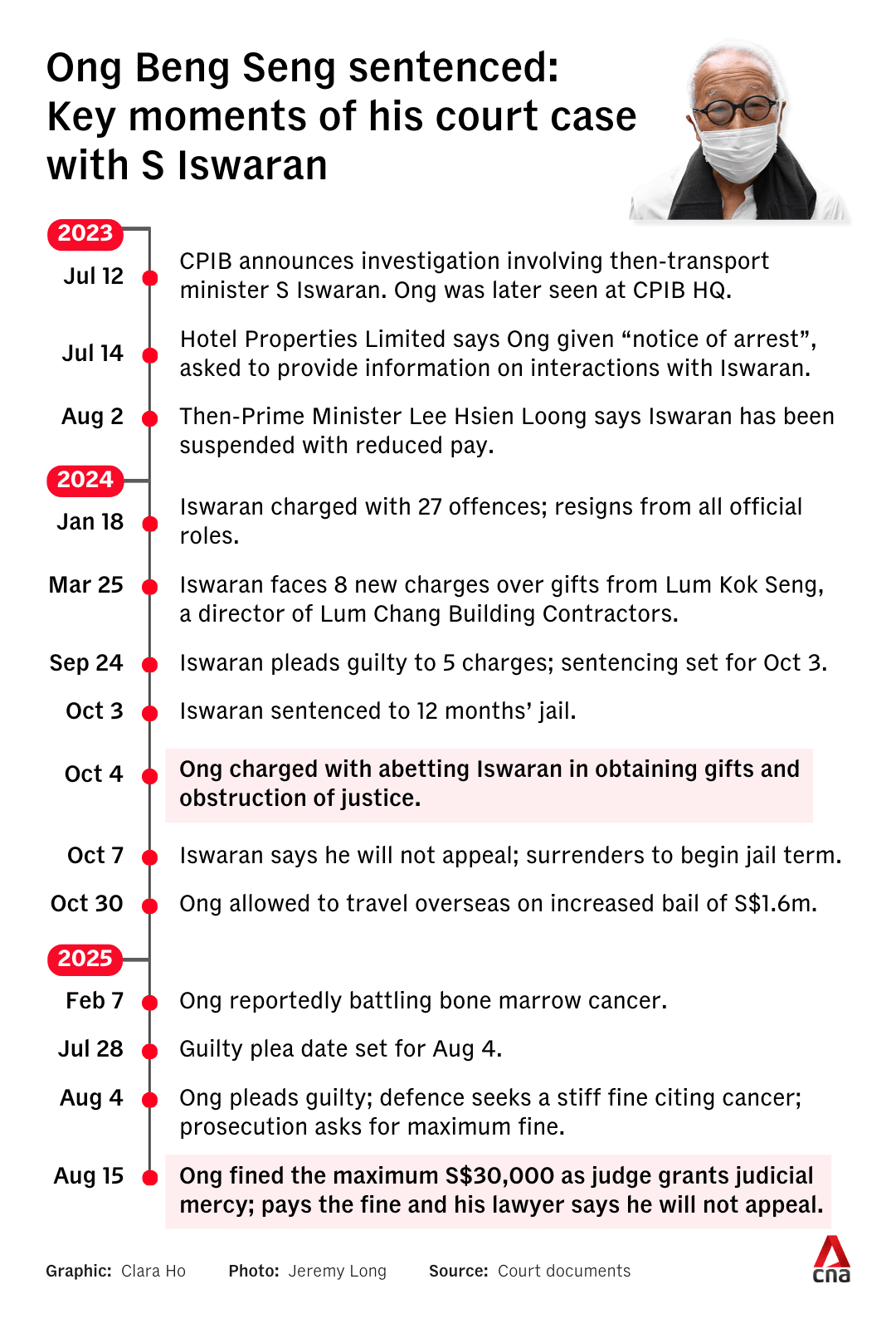 SINGAPORE: Malaysian businessman Ong Beng Seng was sentenced on Friday (Aug 15) to a S$30,000 fine for abetting former Transport Minister S Iswaran in the obstruction of justice.