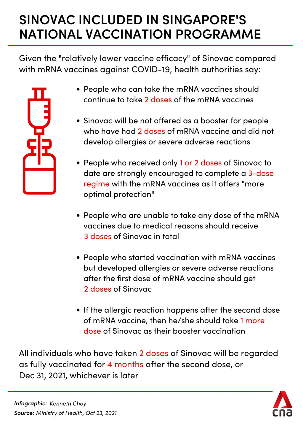 “For those who are medically ineligible for mRNA vaccines but are eligible for Sinovac, they will need to be vaccinated with Sinovac to be considered to be fully vaccinated,” he added.