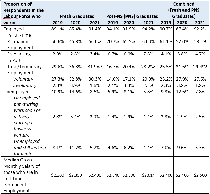 - For post-NS graduates seeking work, 94.2 per cent were employed, up from 91.9 per cent in 2020 and 94.1 per cent in 2019