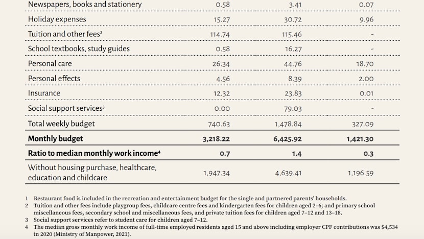 If housing, healthcare, education and childcare are removed, the monthly budgets required for a basic standard of living falls to below S$2,000 for single-parent families, and around S$4,006 for married couples with children.