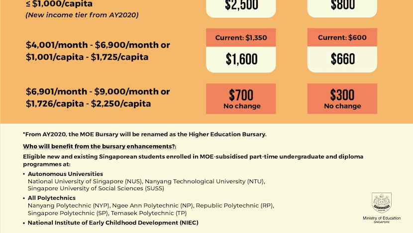 Students who are from households in the lower tier will receive up to S$1,150 more from the bursary.