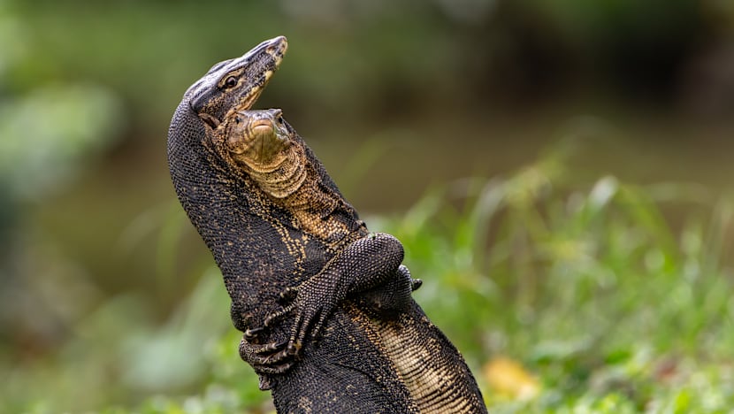 That day, standing roughly 200m away, was the unusual sight of two monitor lizards upright, locked in a brawl.