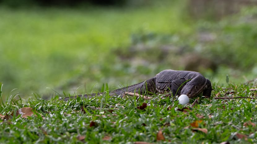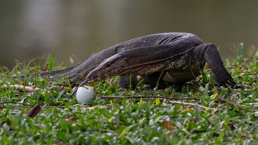 The showdown took place beneath a large tree where herons are known to nest year-round. When CNA visited the spot, another monitor lizard was feasting on a heron egg, a moment Ms Emmett also captured on camera.