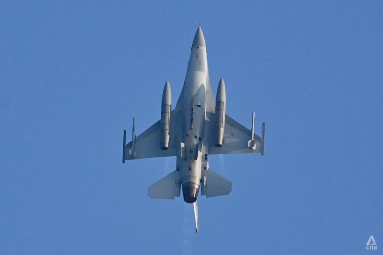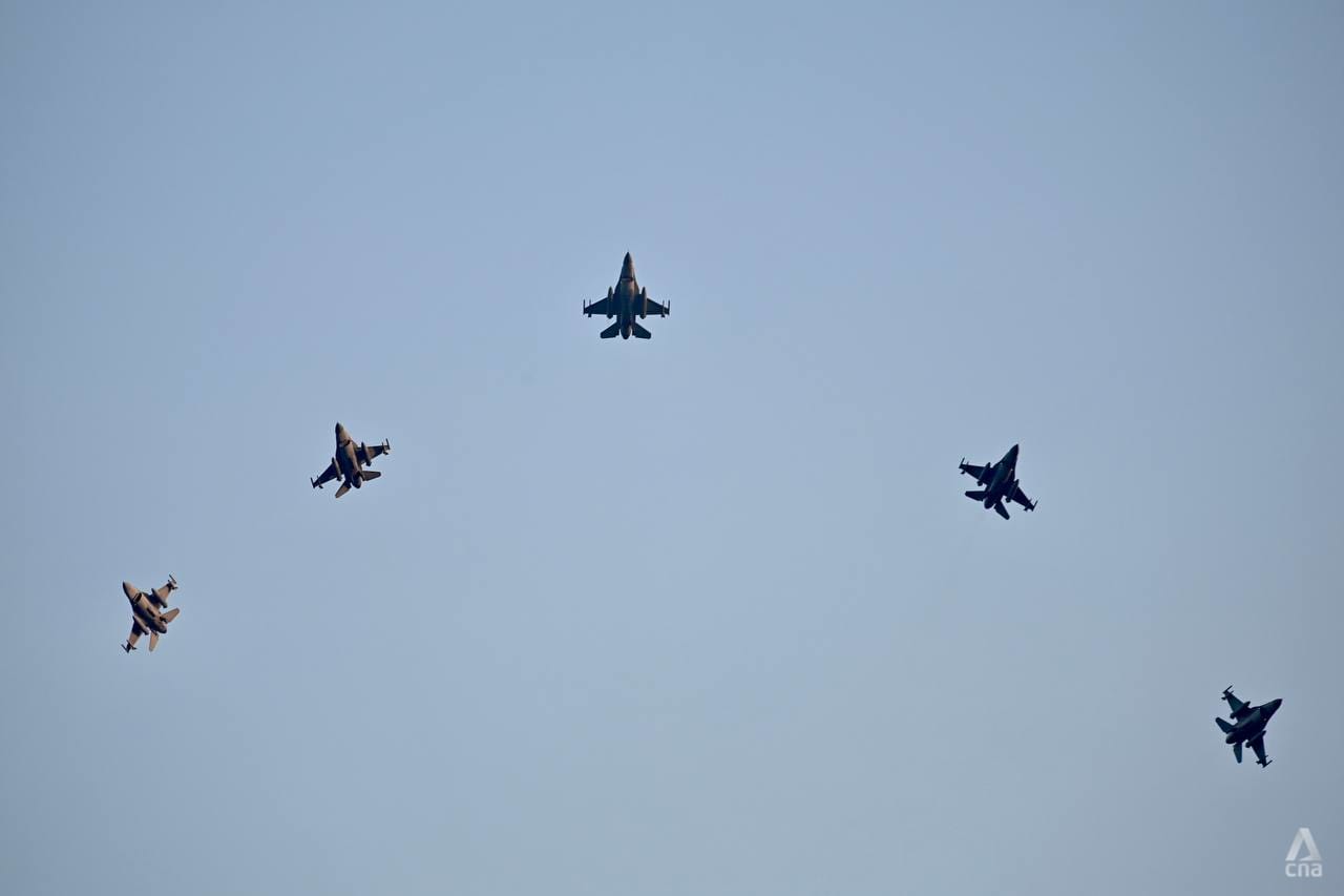 The Republic of Singapore Air Force's (RSAF) F-16 fighter jets in aerobatic manoeuvres over Marina Bay at National Day Parade 2022. (Photo: CNA/Jeremy Long)